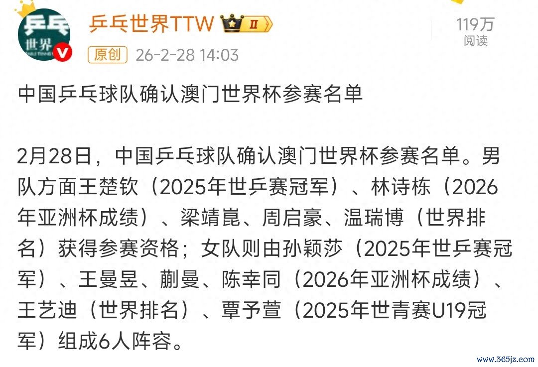 根据国乒教练组给出信息,女队方面,6名选手均通过不同渠道获得资格:孙颖莎和覃予萱分别凭借2025年多哈世乒赛和2025年世青赛U19冠军直接入围,王曼昱、蒯曼、陈幸同依托2026年海口亚洲杯成绩晋级,王艺迪则依靠世界排名锁定席位。